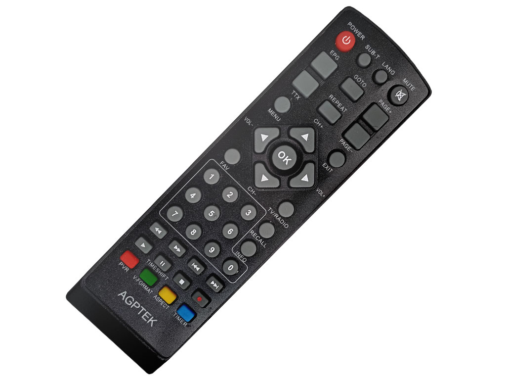 Náhradní dálkový ovladač pro Agptek DVBT2 se všemi funkcemi originálního ovladače.